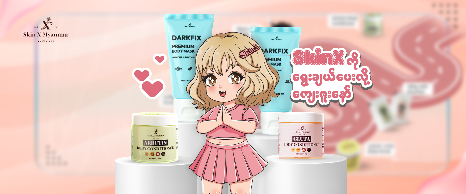 At SkinX Myanmar, our mission is to create high-performance, innovative, and effective skincare products — thoughtfully crafted for the real skin concerns of women across Myanmar. We believe that quality skincare should be both accessible and affordable, which is why we never compromise on ingredients, safety, or results. Every SkinXer is at the heart of what we do, and we’re committed to caring for each customer with honesty, consistency, and a promise that goes beyond the label. More than just products, we aim to uplift confidence and empower glow — from every SkinXer to every part of our brand.