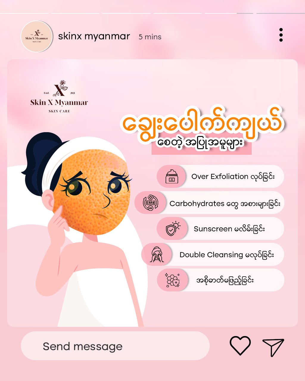ချွေးပေါက်ကျယ်တယ်ဆိုတာ မျိုးရိုး၊ ဟော်မုန်း၊အသက်အရွယ်အရ ကျယ်လာတယ်ဆိုပေမဲ့ ကျယ်သင့်တာထက် အရမ်းဆိုးလာမှ “ဟင်၊ဟယ်” ဖြစ်မဲ့အစား အရင်ကရော ကိုယ်က ချွေးပေါက်ကျယ်စေတဲ့ အပြုအမူတွေ လုပ်ခဲ့သလားဆိုတာ စဥ်းစားပါ။ ချွေးပေါက်ကျယ်တယ်ဆိုတာ မျိုးရိုး၊ ဟော်မုန်း၊အသက်အရွယ်အရ ကျယ်လာတယ်ဆိုပေမဲ့ ကျယ်သင့်တာထက် အရမ်းဆိုးလာမှ “ဟင်၊ဟယ်” ဖြစ်မဲ့အစား အရင်ကရော ကိုယ်က ချွေးပေါက်ကျယ်စေတဲ့ အပြုအမူတွေ လုပ်ခဲ့သလားဆိုတာ စဥ်းစားပါ။ အဲဒီအပြုအမူတွေကို...